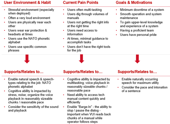 - Observation notes after qualitative interviews with users and SMEs on how they would use speech and language in their environment