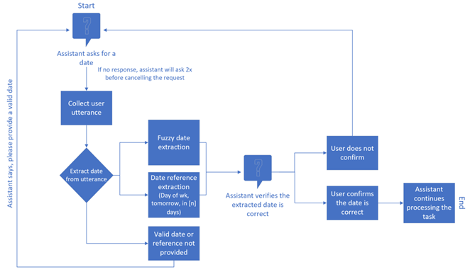 Furthermore, there are endless ways to denote dates, locations, etc., making it difficult for digital assistants to extract accurate and relevant data from the user’s natural language. However, the assistant may infer the desired data format or reference from the dialogue provided and validate this with the user as a follow-on question. The desired data format or type is inferred using fuzzy extraction methods, such as fuzzy date extraction, to isolate the desired data format from the unstructured text. This extracted information is then verified or confirmed by the user to maintain data accuracy and avoid downstream data quality issues.References