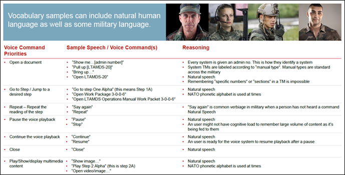 - Vocabulary samples matched with digital assistant commands/skills based on UX research with users and SMEs